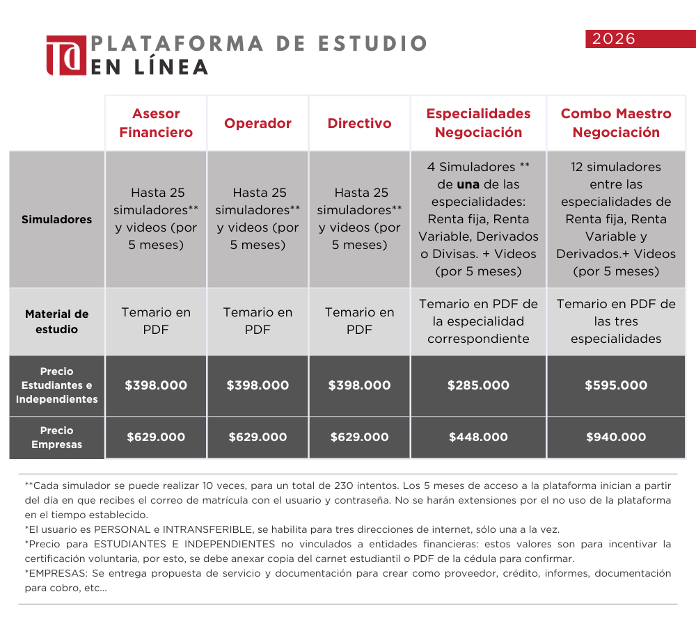 En la plataforma de estudio encuentras videos de las clases, temario en pdf y acceso a 25 simuladores con 10 intentos cada uno; los cuales permiten familiarizarse con el tipo de pregunta, memorizar normas, diferenciar conceptos, desarrollar ejercicios, adquirir el ritmo y el tiempo adecuado en que se debe presentar la prueba, medirse para saber cuando están preparados para presentar el examen, disponibles 24/7, esta herramienta te ayudará a estudiar todos los módulos del examen y practicar las diferentes temáticas. Podrás ver tu avance y calificaciones. El usuario es personal e intransferible, la plataforma se habilita por 5 meses para 3 direcciones de internet ( ejemplo: celular, casa y oficina), solo puede estar una IP activa a la vez.